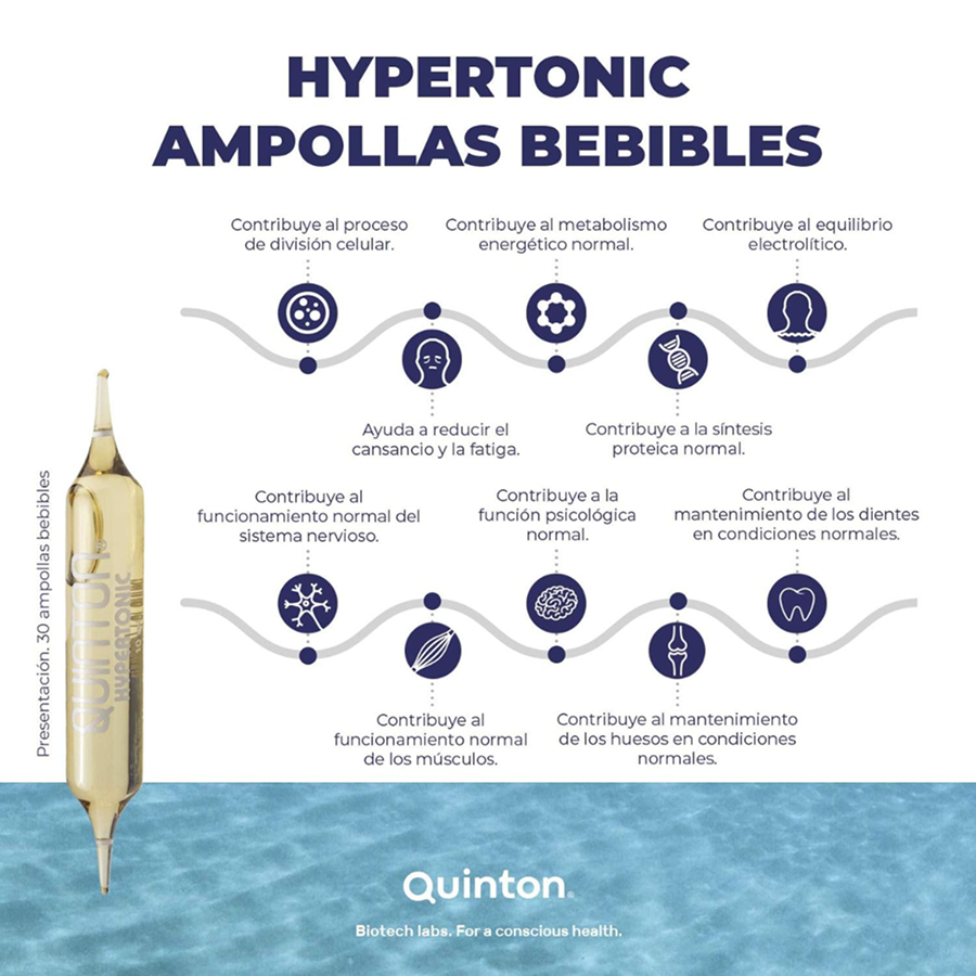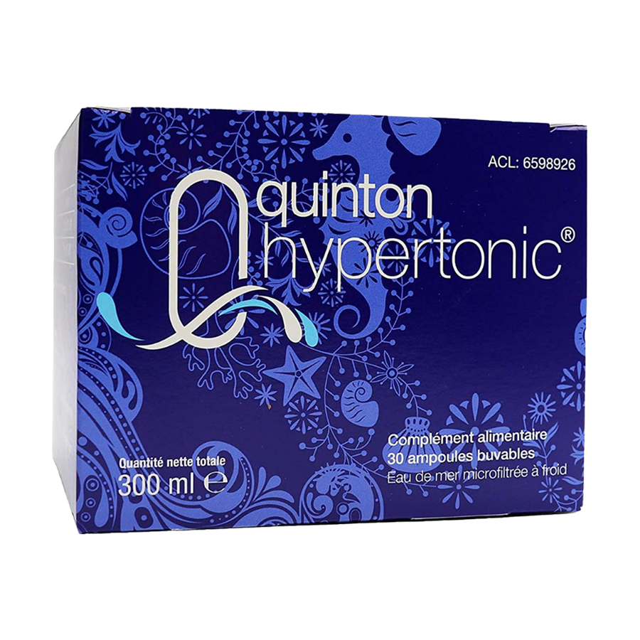 Hipertónica Quinton. El agua de mar Quinton es pura, cosechando en áreas protegidas por laboratorios Quinton, siguiendo estrictos protocolos establecidos por René Quinton. Estos protocolos aseguran que el producto sea de la más alta calidad y pureza. Quinton Ipertonic se diluye a concentración isotónica para cumplir con la matriz extracelular humana (bioterrain). Es un producto ORGÁNICO obtenido a través de microfiltración en frío. Y una ingesta mineral natural para transmineralizzazione. Y un complemento indicado para actividades deportivas.