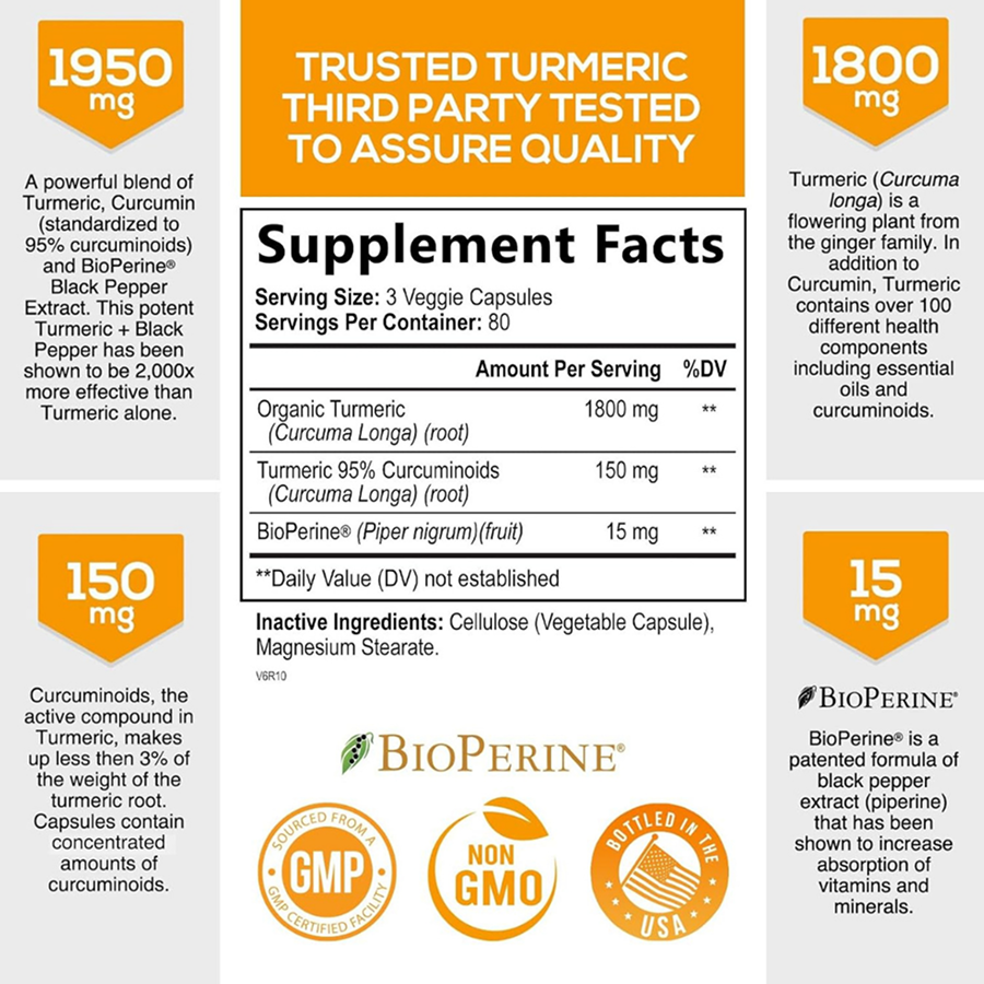Cúrcuma de fuerza extra: nuestro complejo de curcumina de cúrcuma T3 premium de 1950 mg; con 95% de curcuminoides estandarizados; y mejorado con 15 mg de BioPerine para proporcionar la máxima absorción y biodisponibilidad.