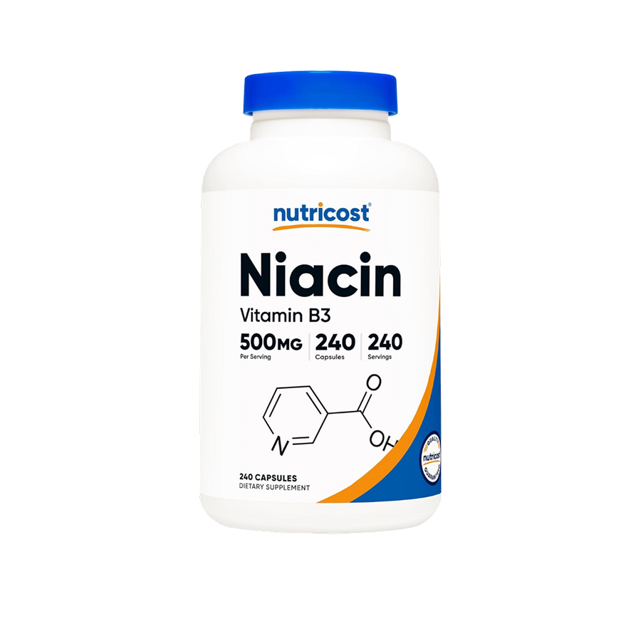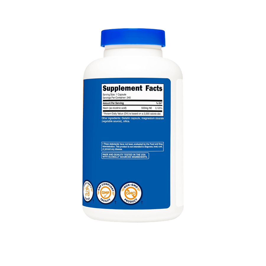 Suplemento Nutricost de 240 cápsulas de Niacina, con 500 mg de Niacina (Vitamina B3) de alta calidad por cápsula. Estos no contienen OGM ni gluten.